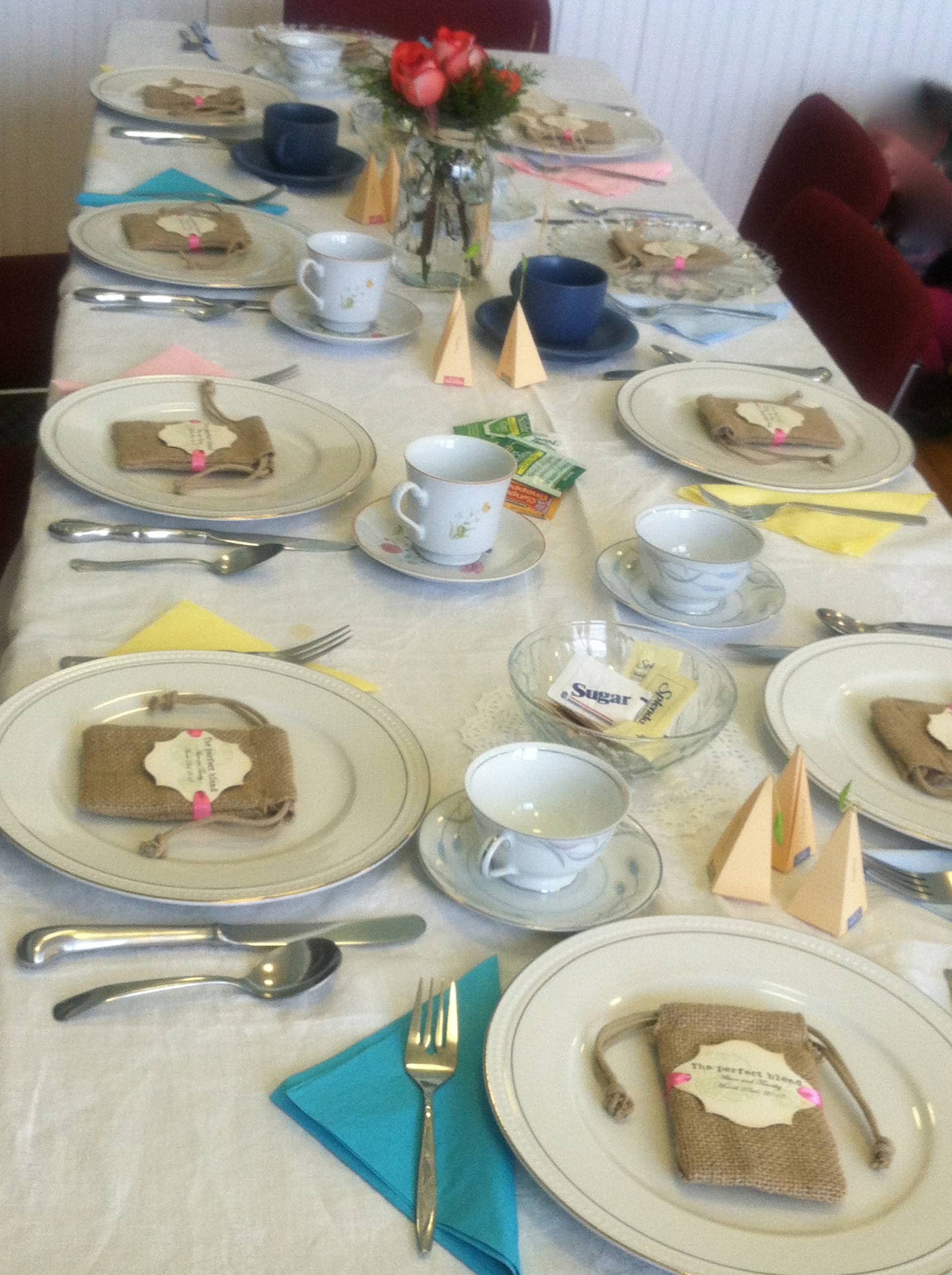This tea was a true labor of love. All the components were toted from S’s home to the site of the tea – a local treasure – a recently renovated old school house used as a community center. Food, dishes, table settings, tea pots and more were carried to the site. It was quite a whirlwind setting up for the tea with bridesmaids, parents, friends, grandmothers, aunts and uncles participating. It turned out beautifully, don’t you think? We all had such a wonderful time.